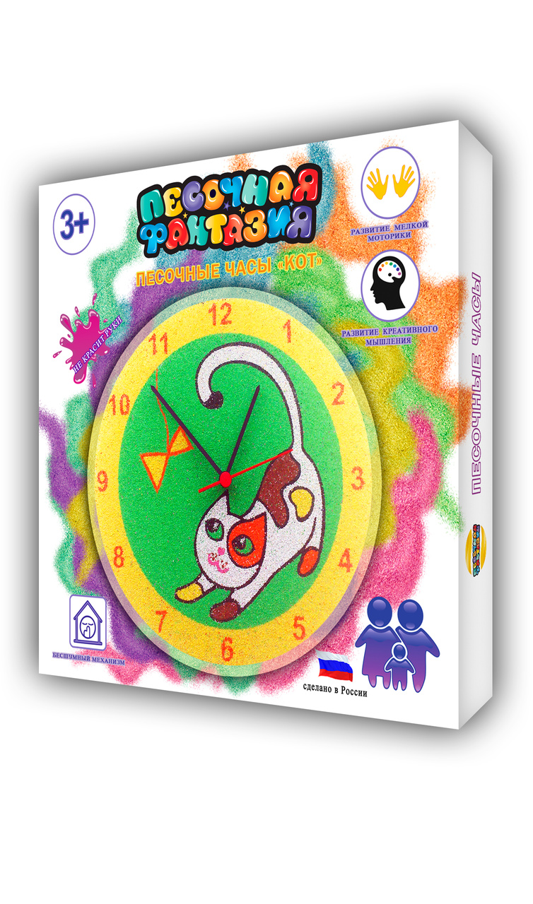 В набор входит: циферблат-трафарет (трехслойная пластиковая основа с вырезанным лазером контуром рисунка d=25см), бесшумный немецкий часовой механизм, 9 цветов песка в пластиковых контейнерах (по 60г), подробная фото-инструкция.