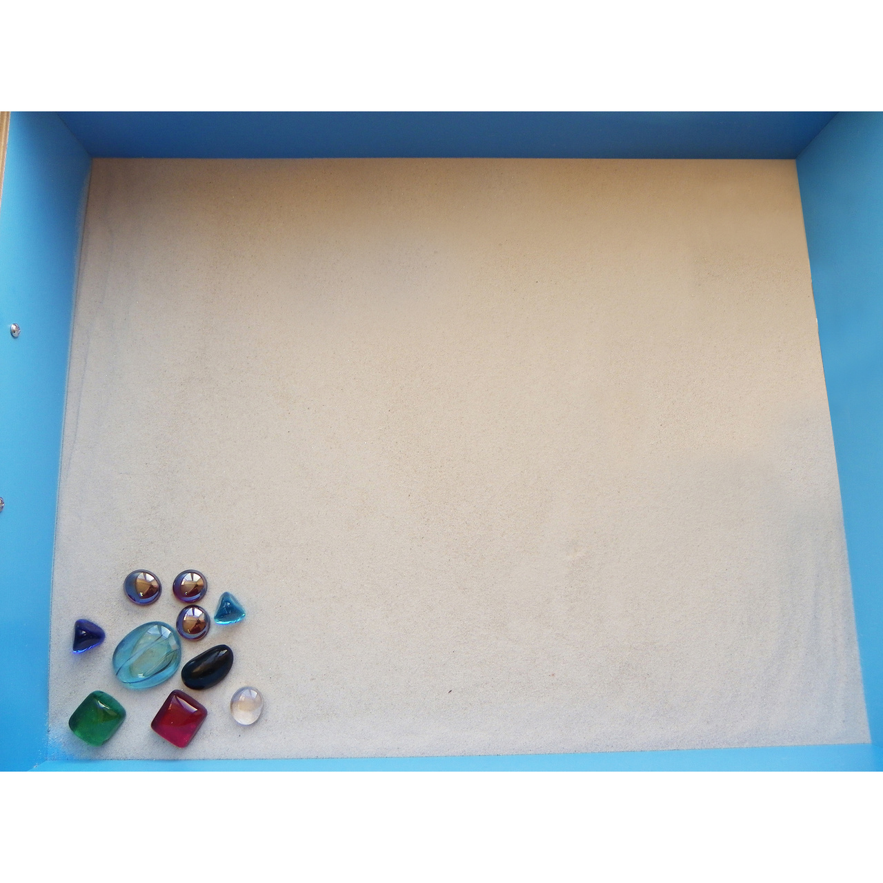 В набор входят: песочница, цветной кварцевый песок на выбор 3 кг, 1 игровой комплект (декоративные камушки).