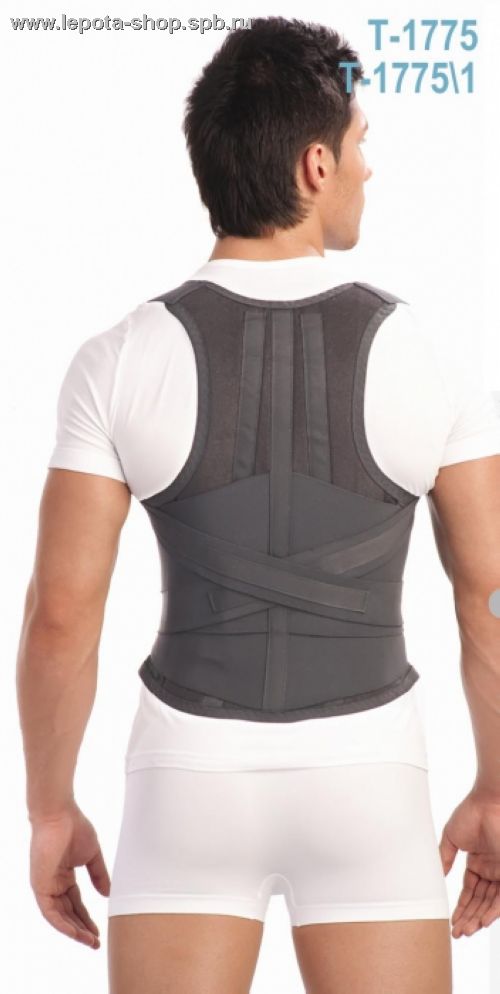 состоит из пояса, фиксирующего поясничную область, и задней панели с лямками, обеспечивающими регулируемое разведение плеч;