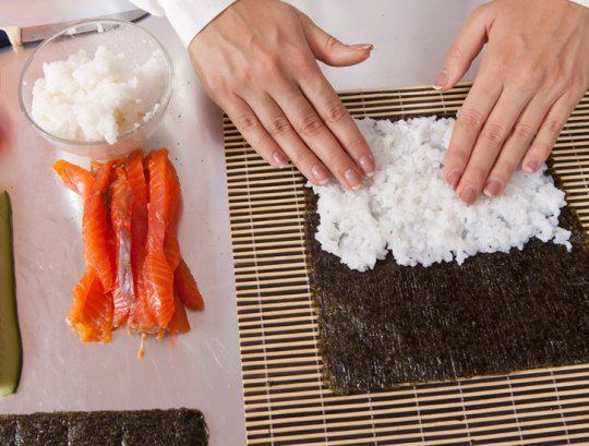 3. Смочить руки подкисленной водой и зачерпнуть примерно четверть от общего количества риса, выложив его ровным слоем поверх нори, оставляя свободным 3-4 см дальнего от вас края.